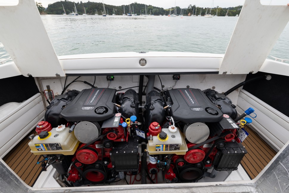 Thunderballs is a great option for kiwi boating, with her refined internal finishes, presenting a new, fresh look. It has upgraded the 27 Runabout with some lush and warm fabrics, inviting some refreshing appeal and included piping on the seat and trim cushions. The laminate edges are now fully trimmed and the wide cockpit is supplied with a teak-look pop-in carpet that adds considerably to the prestige finish.