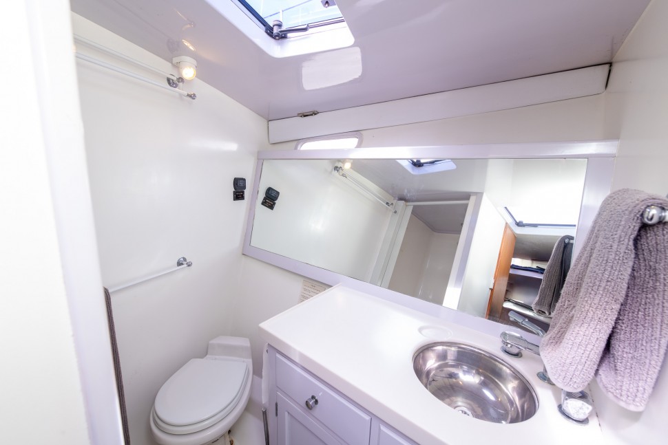 Accommodation is spacious and thoughtfully arranged, offering excellent comfort for family cruising or entertaining guests. The port-side master cabin features a queen-sized bed, while the forward cabin includes bunks sleeping up to four people. The saloon is light and inviting, with a drop-down table that allows for flexible use as a dining area or additional sleeping space when required. The overall layout provides versatility without compromising comfort.