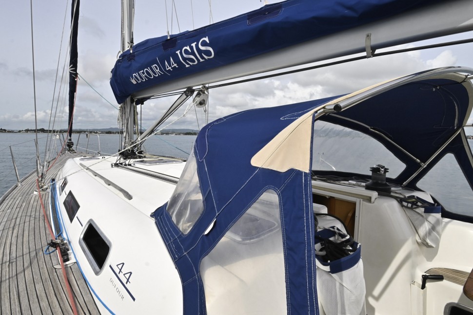 The Dufour 44 is designed by Umberto Felci and reflects that design house’s vast experience in both fast passage-making boats and all-out racers. ISIS features modern design concepts: a plumb bow, fine entry and long waterline length, with a generous beam extended towards the stern. She is designed for easy single or short-handed sailing, with the mainsail track on the cockpit sole at the foot of the steering column and well-placed genoa winches. Visibility and movement around the decks are enhanced by the wide side decks and recessed chainplates.