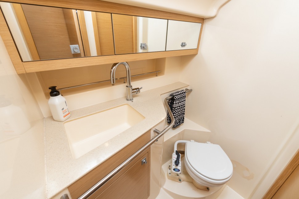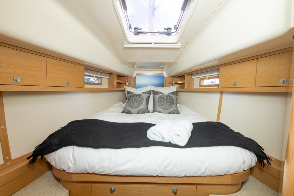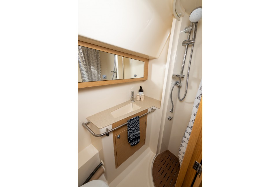 Step below and you’ll find a bright, spacious interior finished in light timber with plenty of natural light from the large hull windows and deck hatches. The generous saloon and galley make entertaining a pleasure, while the three-cabin layout provides excellent accommodation. The forward owner’s cabin is a standout, featuring an island double berth, private ensuite, and plenty of storage. A second head serves the two roomy aft cabins, making this yacht ideal for family cruising or sailing with friends.