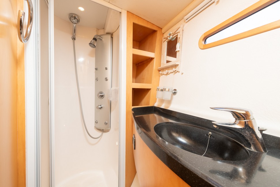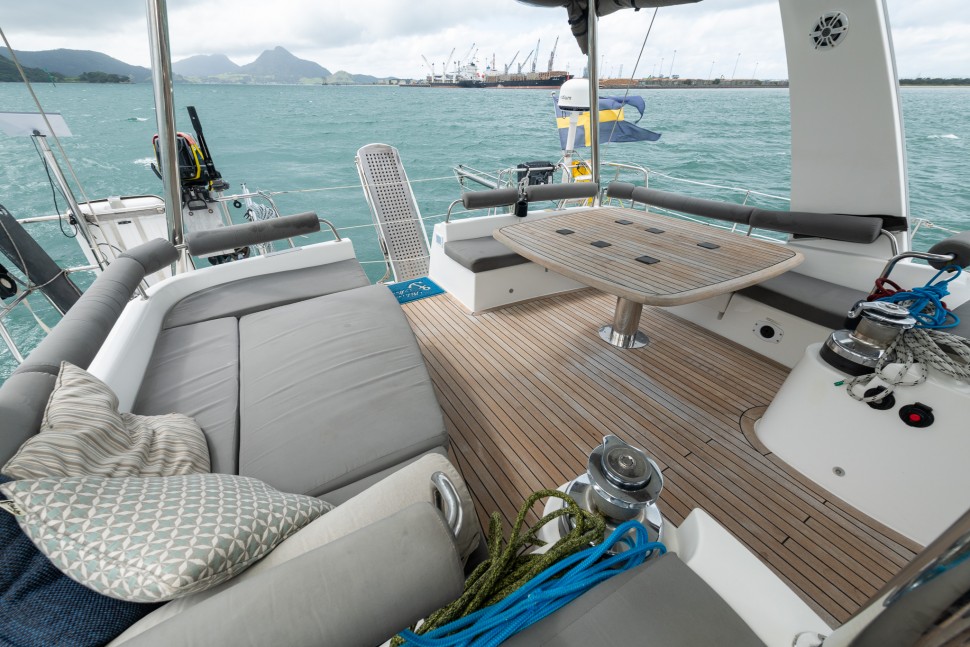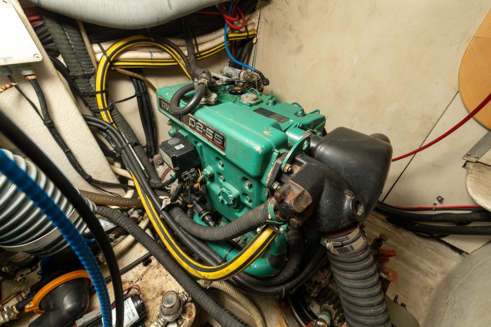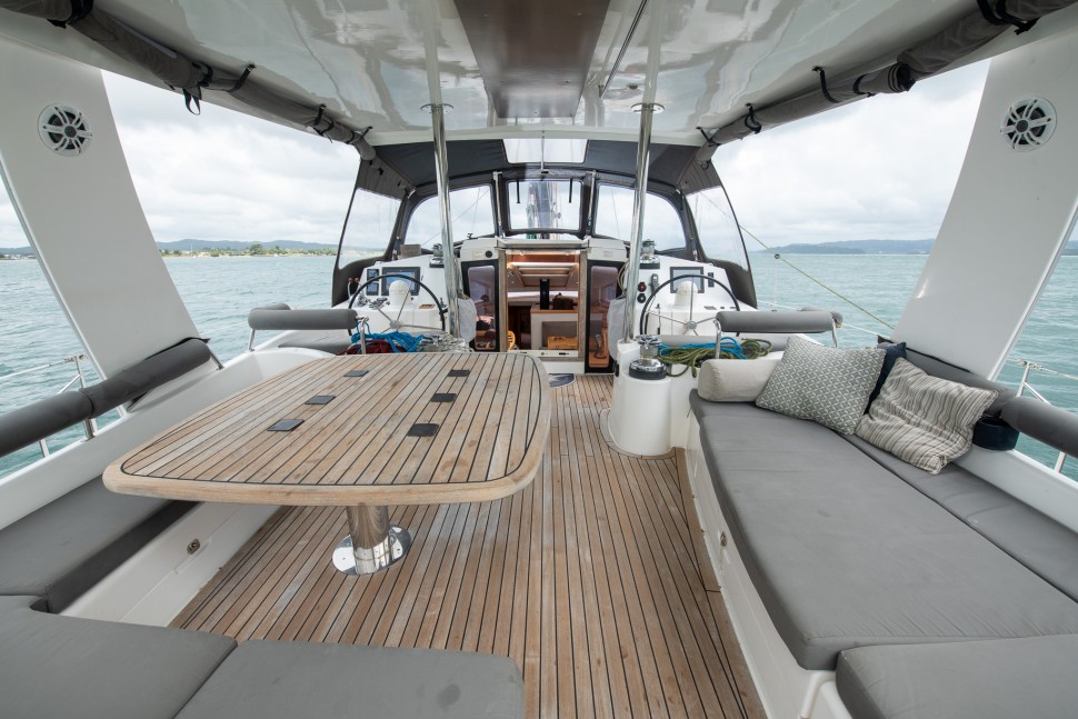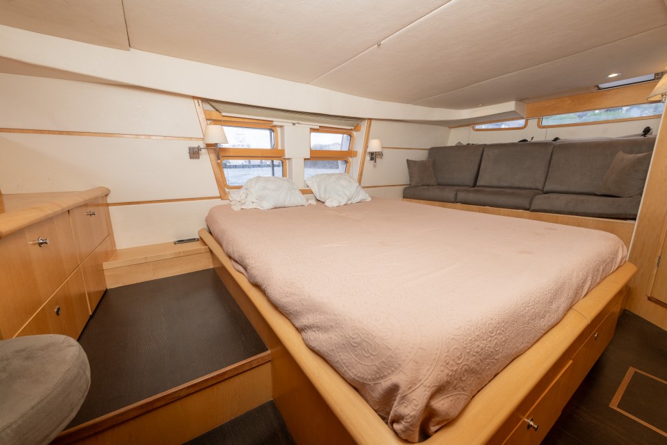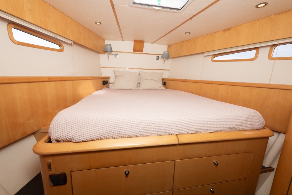 Under power she is equally unique, with two independent Volvo Penta 55 hp engines and saildrives, giving catamaran-style redundancy and impressive charging capability. Add a walk-in engine room, separated and clearly organised systems, a huge protected cockpit with hardtop and full enclosure, and a bright 360-degree deck saloon, and you have a turnkey yacht built for long-range living.
