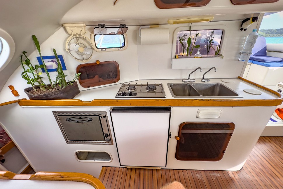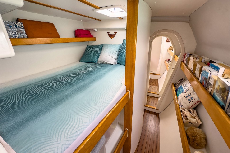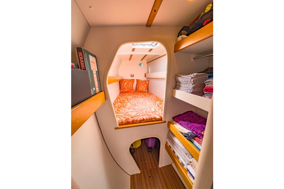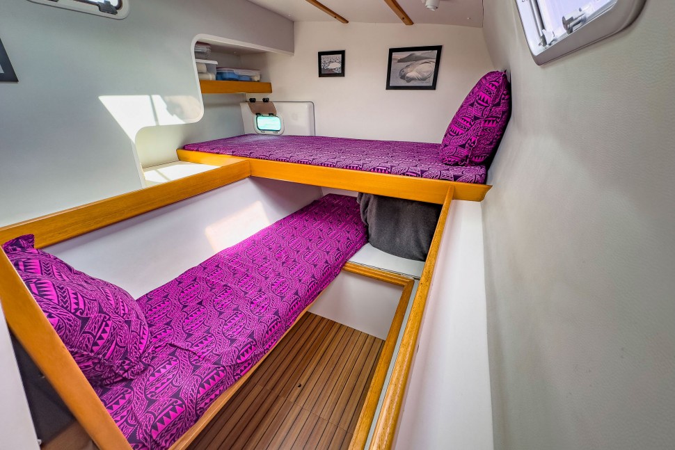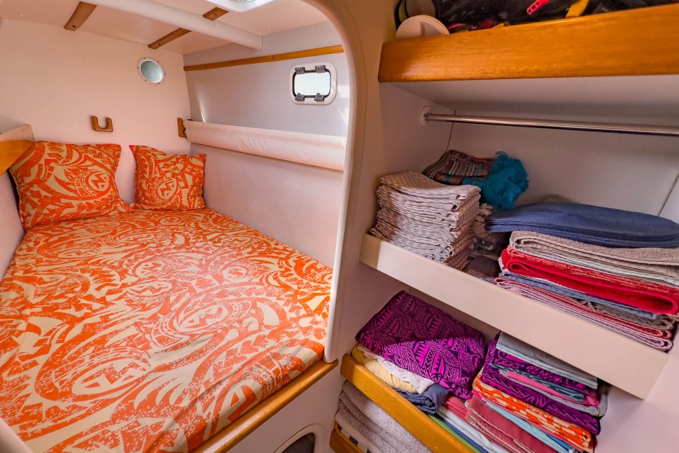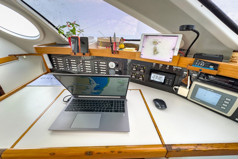 This catamaran has been owned by two dedicated individuals. The first owner (2001-2008), who is now the General Manager of Outremer, achieved victory in the ARC in 2001 and completed an Atlantic circuit. The current owners, a childless couple, purchased the boat fully refurbished by the Outremer shipyard. They crossed the Atlantic, basing the vessel in Martinique for seven years, and used it primarily for vacations. In 2015, they returned to the Mediterranean for a complete refit at Outremer, including the installation of a bimini and stern extensions at Navibois in Sète. Their adventures continued with another Atlantic crossing and extensive exploration of the Caribbean and Central America.