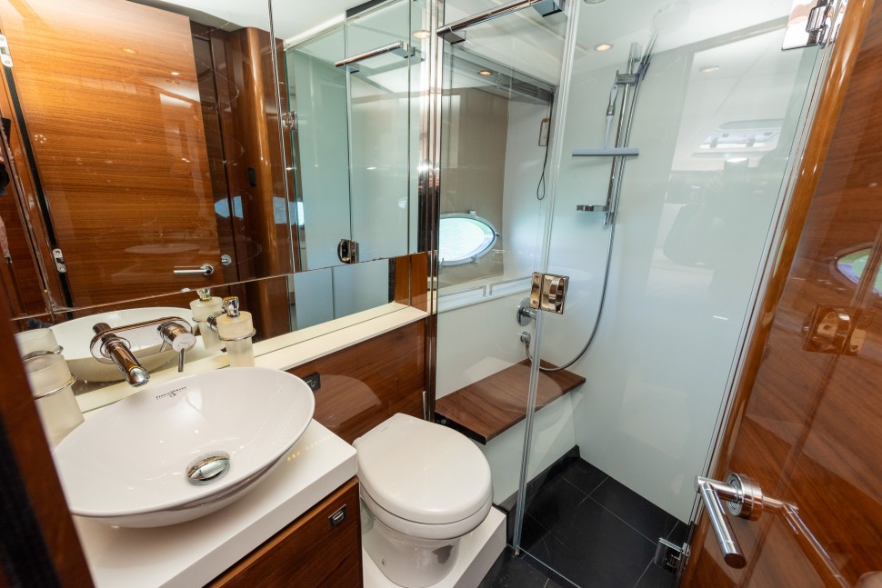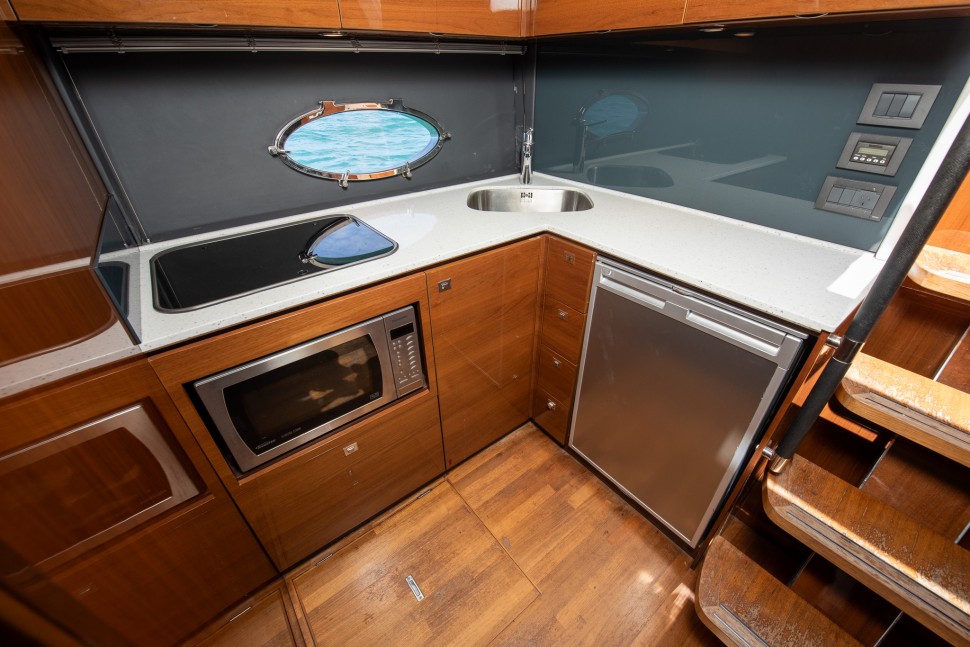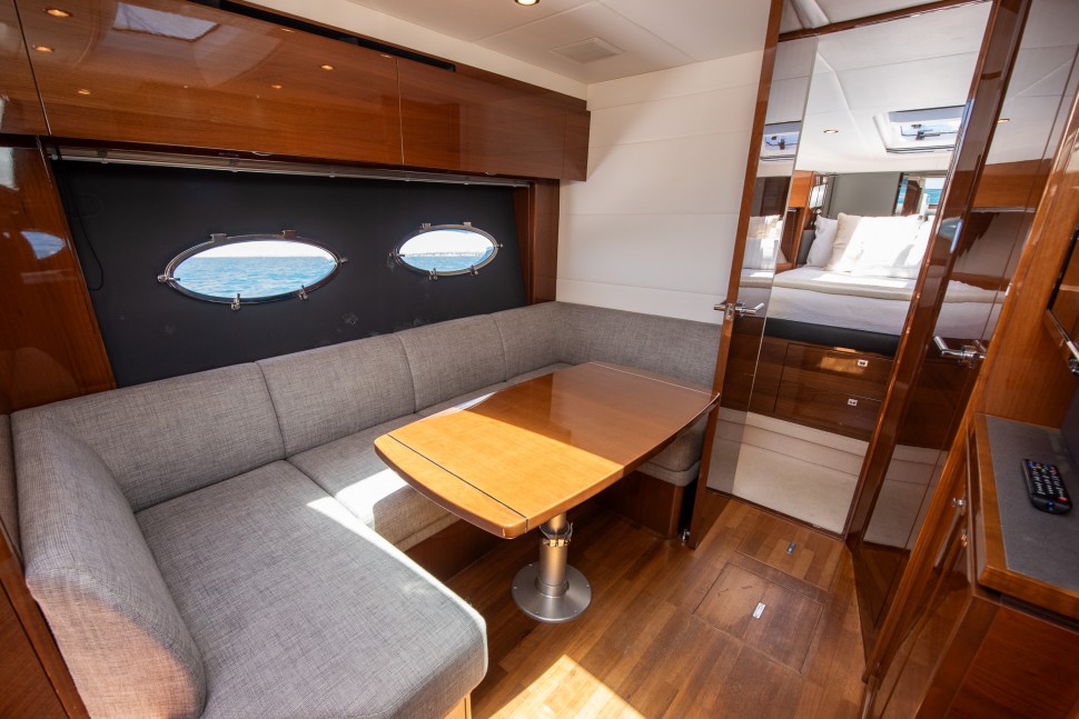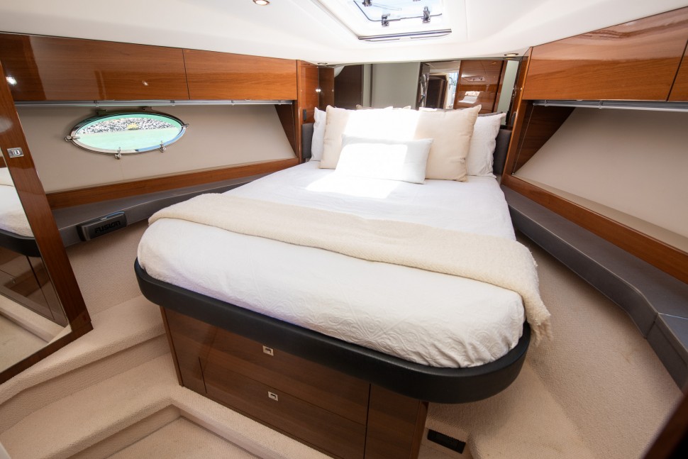 Entertaining all those onboard is easily achieved across the vessel with a highly attractive sized cockpit that includes a wet bar and electric barbecue for alfresco dining in comfort, with a generous sized boarding platform out back that naturally draws attention. This whole space is an area that seamlessly adapts to the weather conditions with full cockpit enclosing canvas and the touch of luxury electric sunroof.
