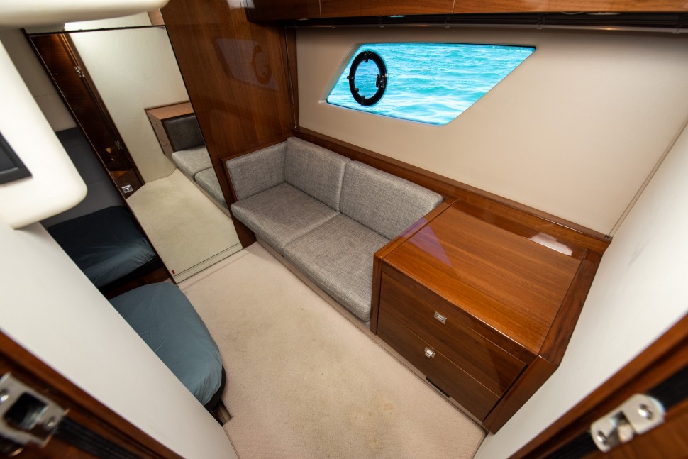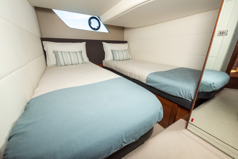 A master cabin serviced by an oversized ensuite is located in the bow, while back aft and below decks a full-beam cabin featuring twin singles, convertible to make a double, provides a quality space for the kids or any VIP guests. Another convertible berth presents itself with the saloon table next to the well-equipped galley.