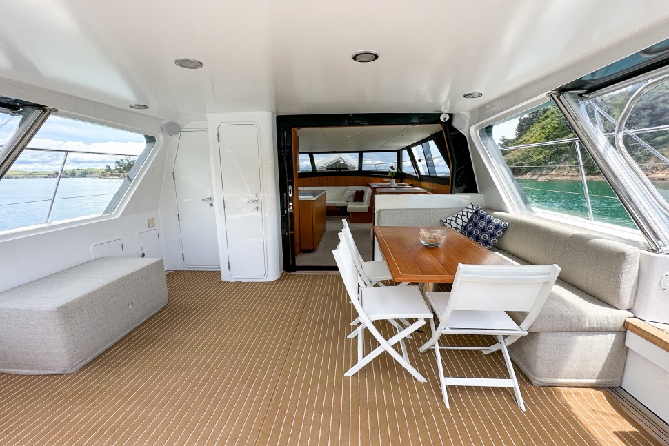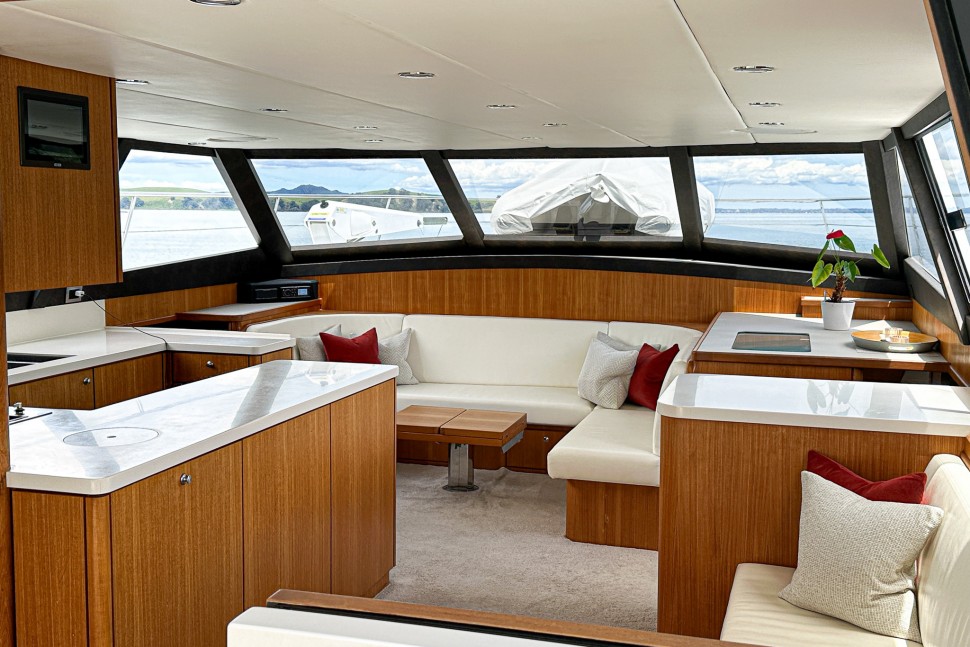 The Simrad electronics suite, including radar, autopilot and multifunction displays, ensure confident navigation. Escape also features a plug in docking controller alongside electronic steering and throttles for precise handling. In 2019, the cockpit interior was redesigned, adding a modern seating arrangement with entertainment in mind, making the space fully enclosed and even more inviting to all those onboard.