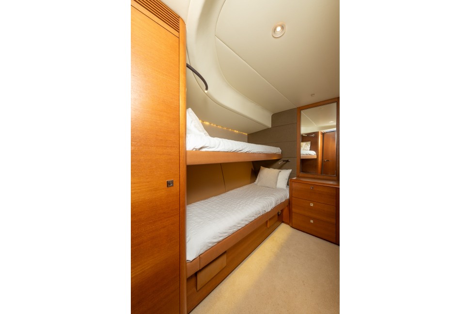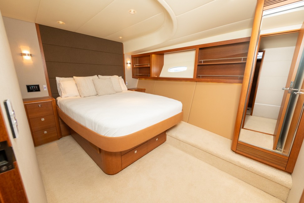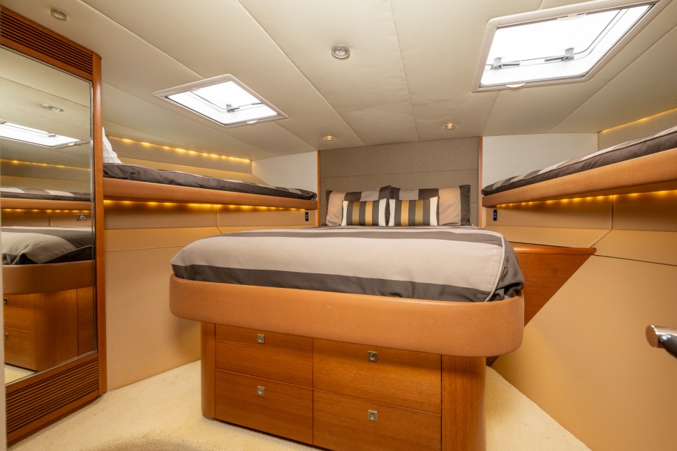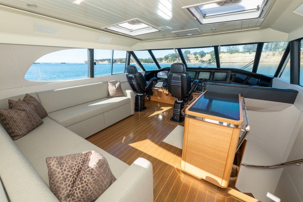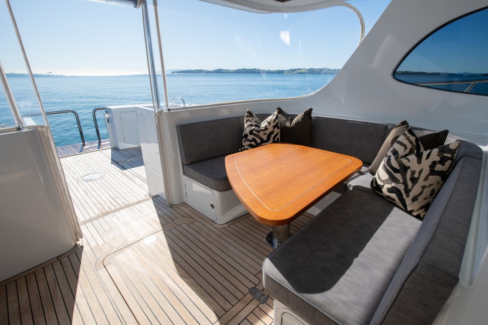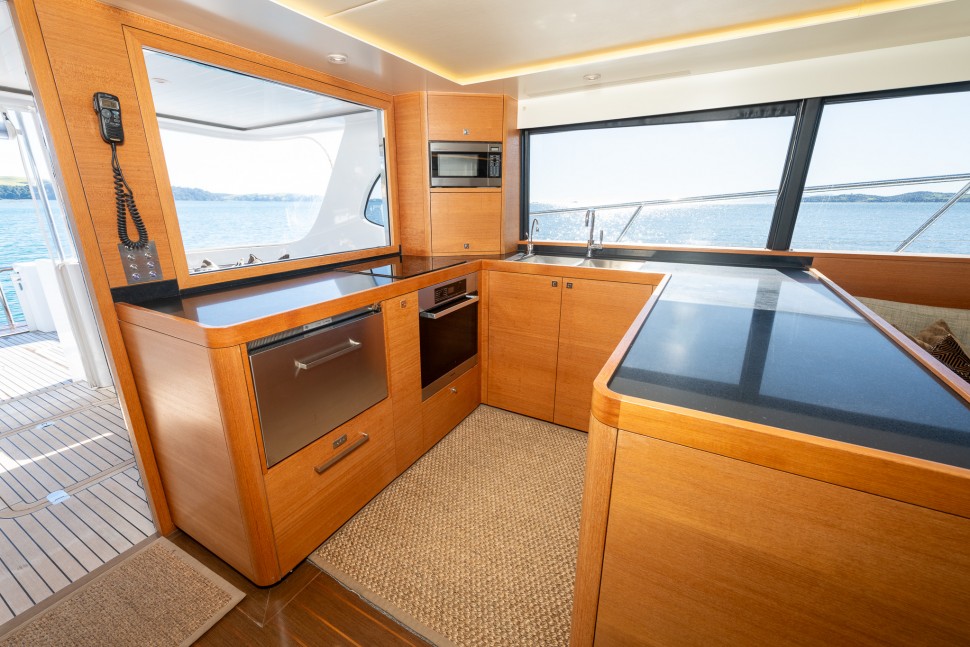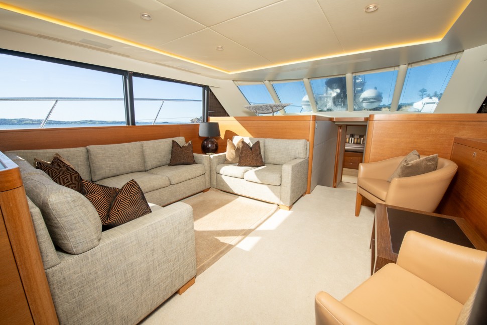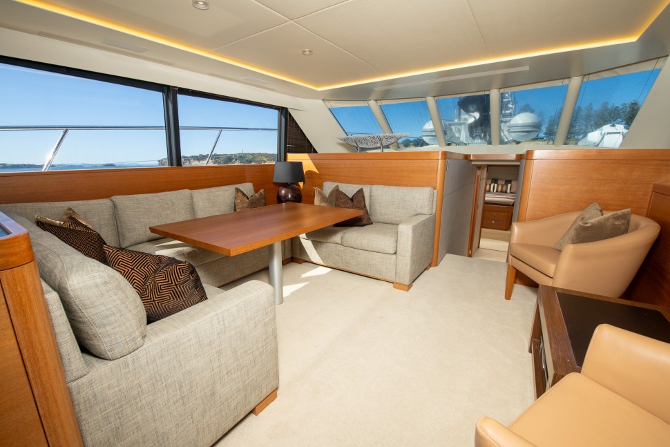 Step inside and discover an interior that was completely customised to the highest standard. Every element—from the joinery to the ceiling, wall panelling, and recessed mood lighting—was carefully designed to create a seamless flow throughout. The result is discreet luxury, tailored for both family cruising and serious game fishing. Ekara is one of only two 68s with forward-facing saloon windows, and her clever layout retains the traditional aft galley opening out to a huge alfresco dining space. The saloon includes a fully retractable dining table, which disappears from view when not required.