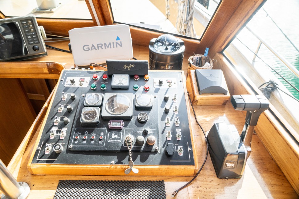 She combines the rugged capability of a motor yacht with the elegance and efficiency of a sailing vessel. ‘Margaret M’ is ideal for extended cruising in comfort and style. Powered by a frugal John Deere 120hp diesel supplemented with a furling headsail and mainsail, she is easily managed.
