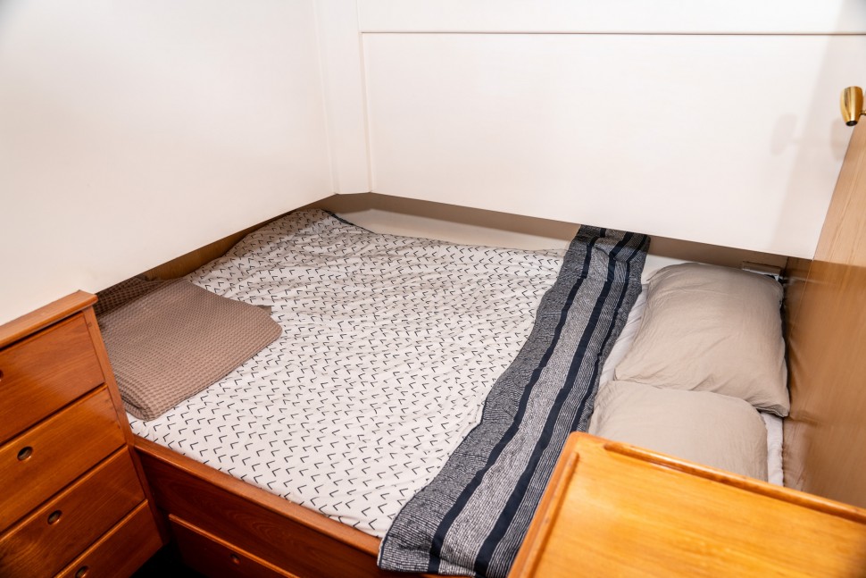 Accommodation is for up to six in three cabins, ideal for family and friends. Winter is the ultimate time for cruising in NZ, and this is made extremely comfortable with heating provided by a diesel stove. She is equipped with a comprehensive array of electronics; satellite TV and electrical power can be supplemented with the 4.5kva Kohler genset. The list of onboard equipment includes a RIB with outboard, an electric capstan, and the list goes on!