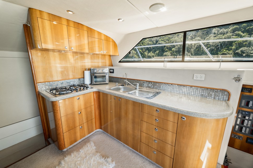 Up top, the flybridge is a highlight; with wraparound seating, twin helm chairs, upgraded electronics, and a commanding view of your cruising grounds. Whether you’re setting off on a coastal adventure, diving trip, or relaxed family cruise, Pacific Dancer is a capable, practical, and ready-to-go vessel.