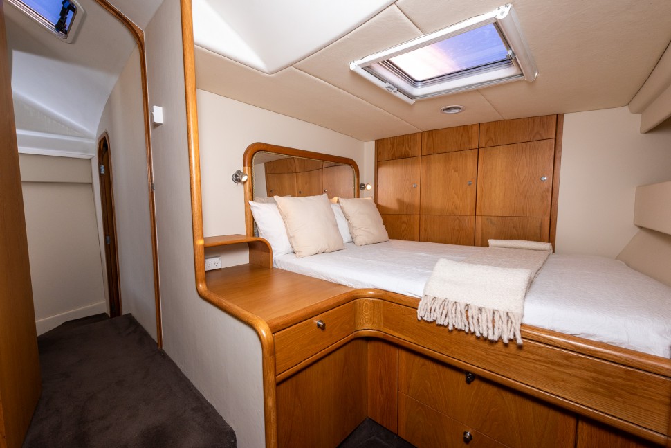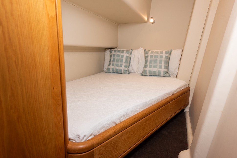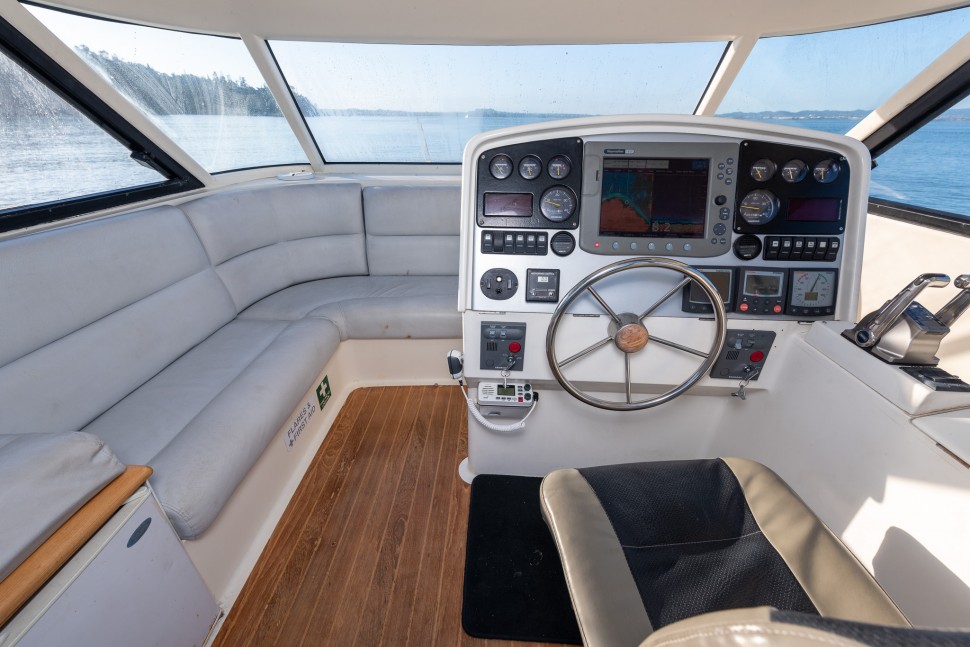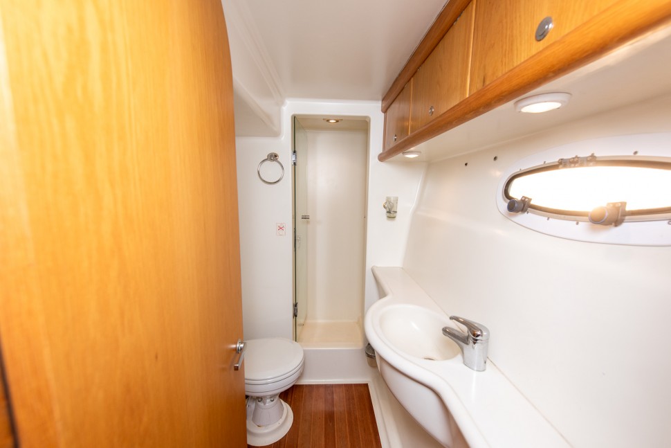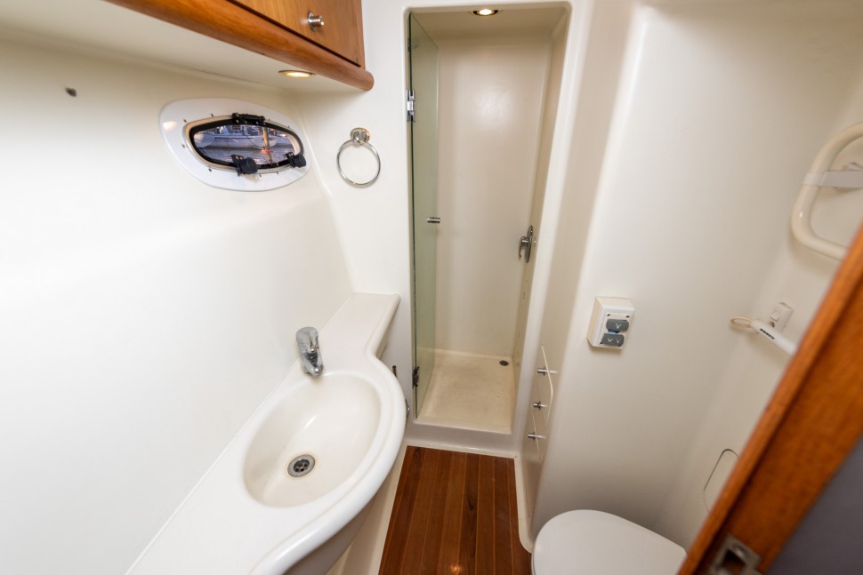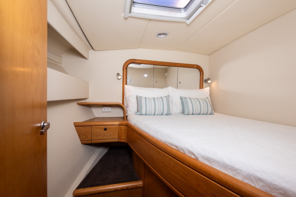 A three cabin arrangement all with generous double berths allows you to sleep six with the master cabin having a private bathroom and the second aft bathroom for guests. When not using the cabins, the crew will enjoy the well configured saloon and seating area with great flow to the large sized cockpit where entertainment in the sun is guaranteed whether socialising, fishing or relaxing. Fishing for the big one also made achievable with the game rigged poles.
