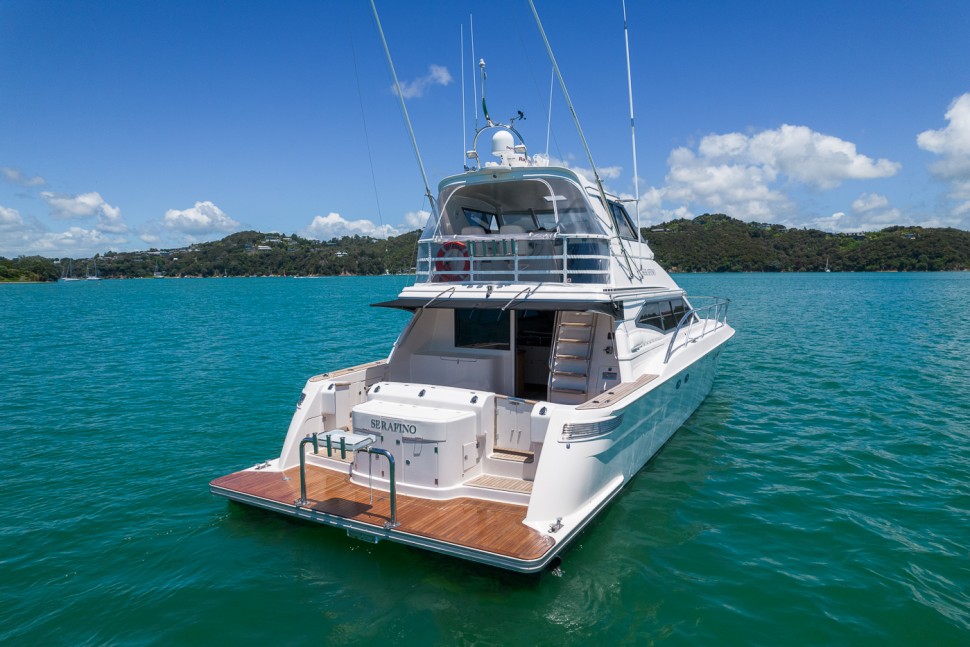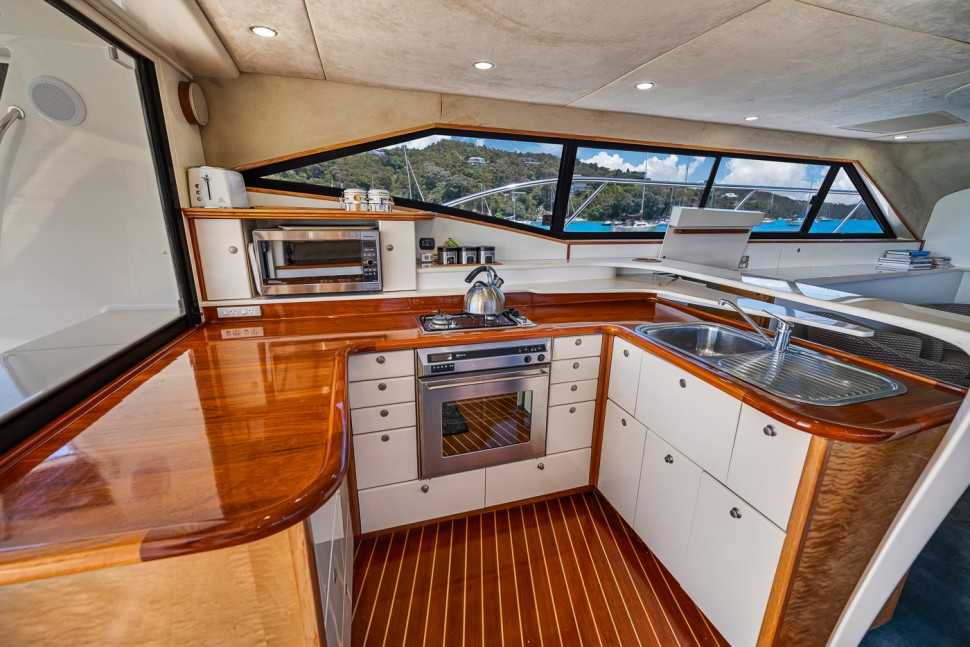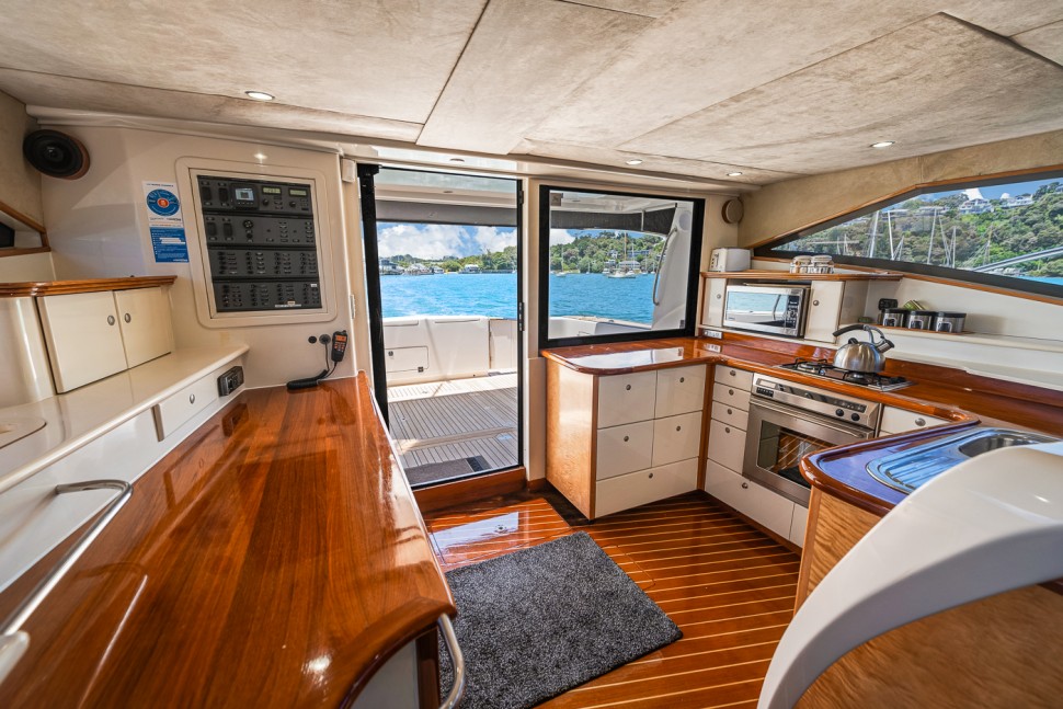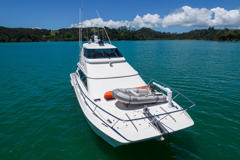 - Aft deck with BBQ, sink, fish-filleting table, and life raft storage