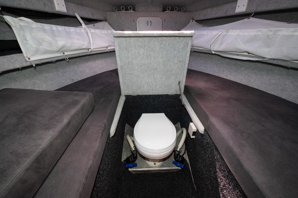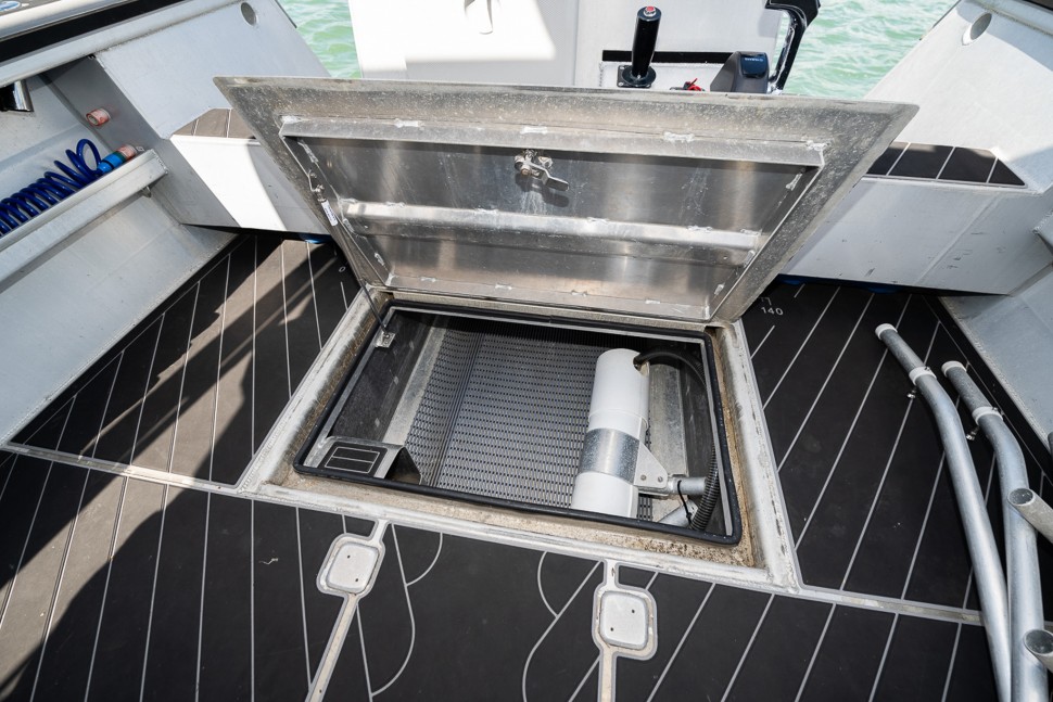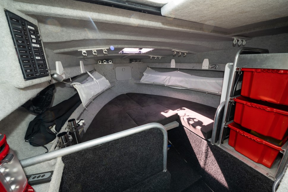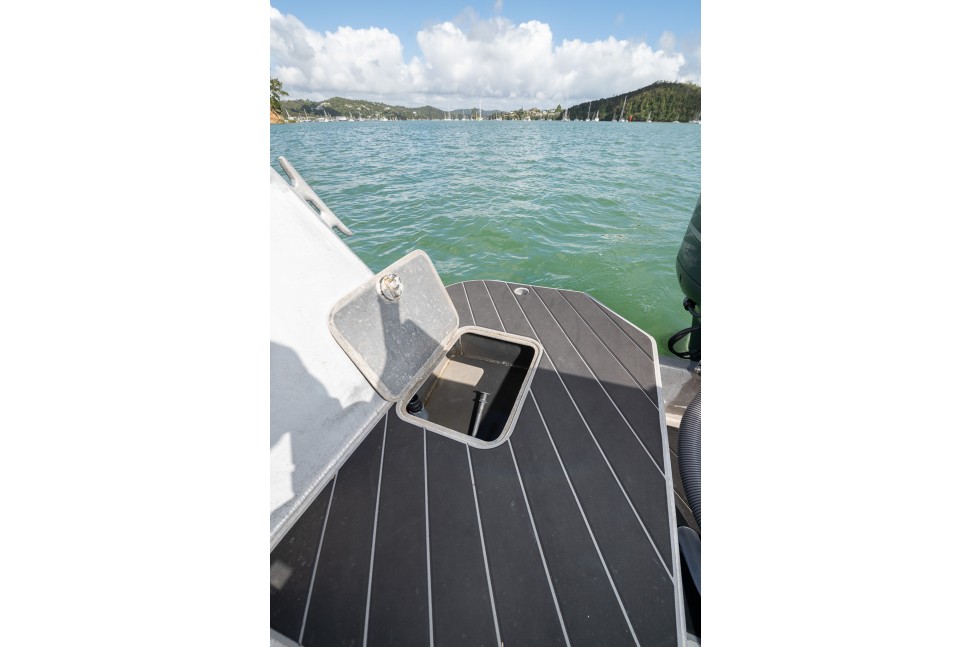 On the trailer she’s just as sorted: alloy trailer, alloy boarding stairs, a 12-volt electric trailer dolly for easy manoeuvring, and a full storage cover. A 320-litre chill-bin with deck fittings and a Magna BBQ make her a proper all-day, all-weather fishing platform.