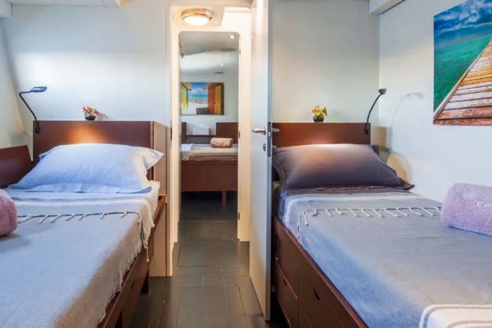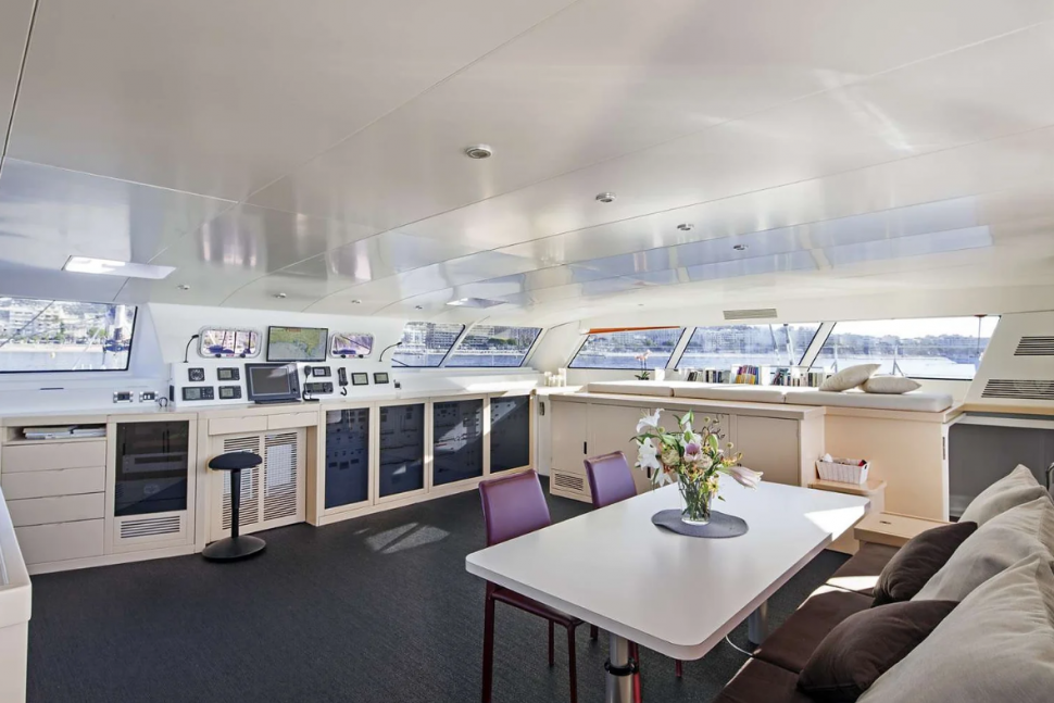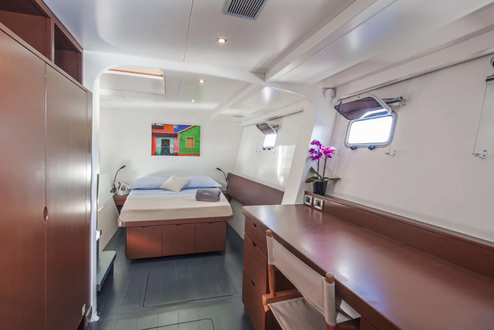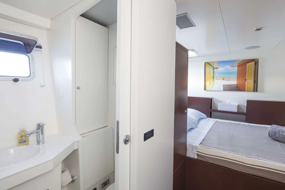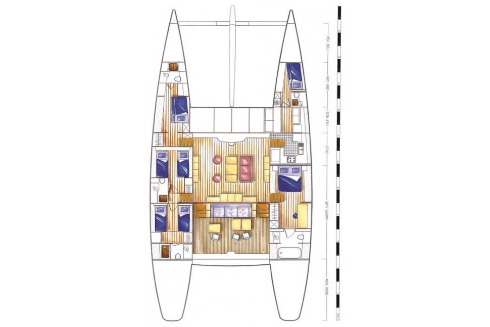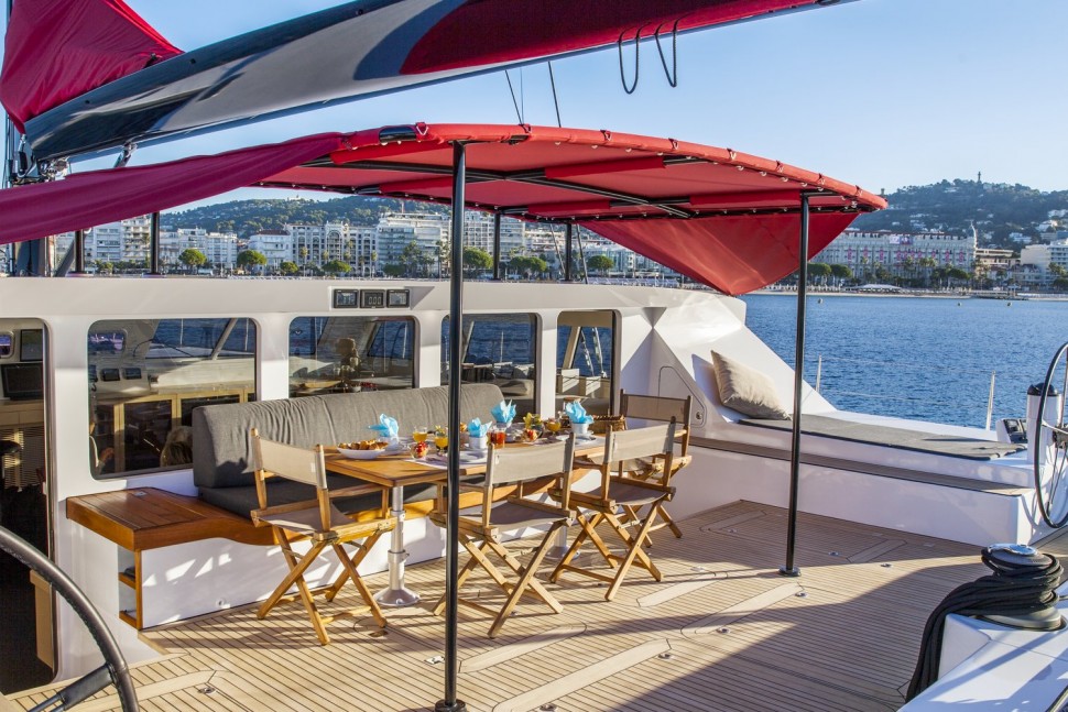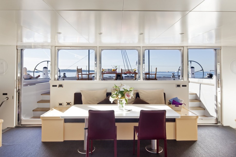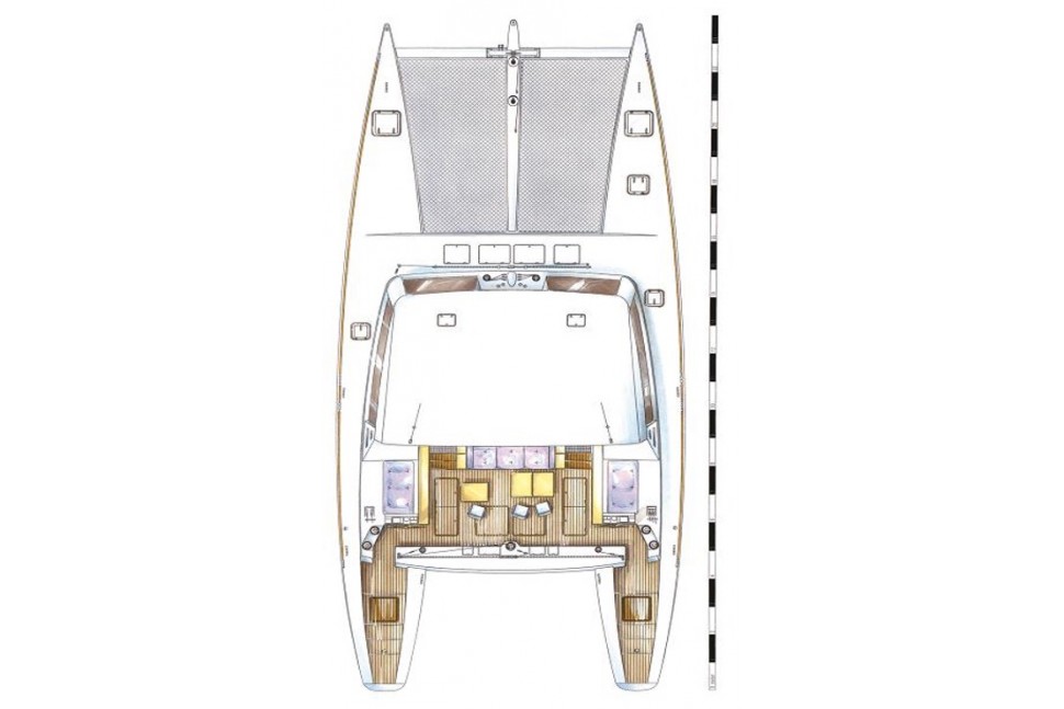 She is a 3 cabins owner version built of Epoxy glass fibre and carbon structure and can be run with 2 crew. She is a safe, fast and light catamaran capable of 300+ nautical miles passage per day. The transverse structure and mast are of carbon fiber in order to keep her strong but light. She is easy to handle with electrical winches, twin helms and a clear view over the coach roof from the cockpit. Her salon offers a fantastic 360° panoramic view and there is dining indoors and outdoors.